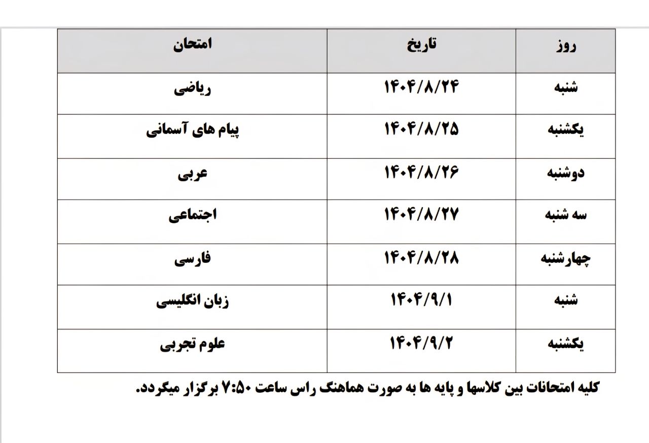 برنامه امتحانات میان نوبت آذرماه - سال تحصیلی 1404-1403